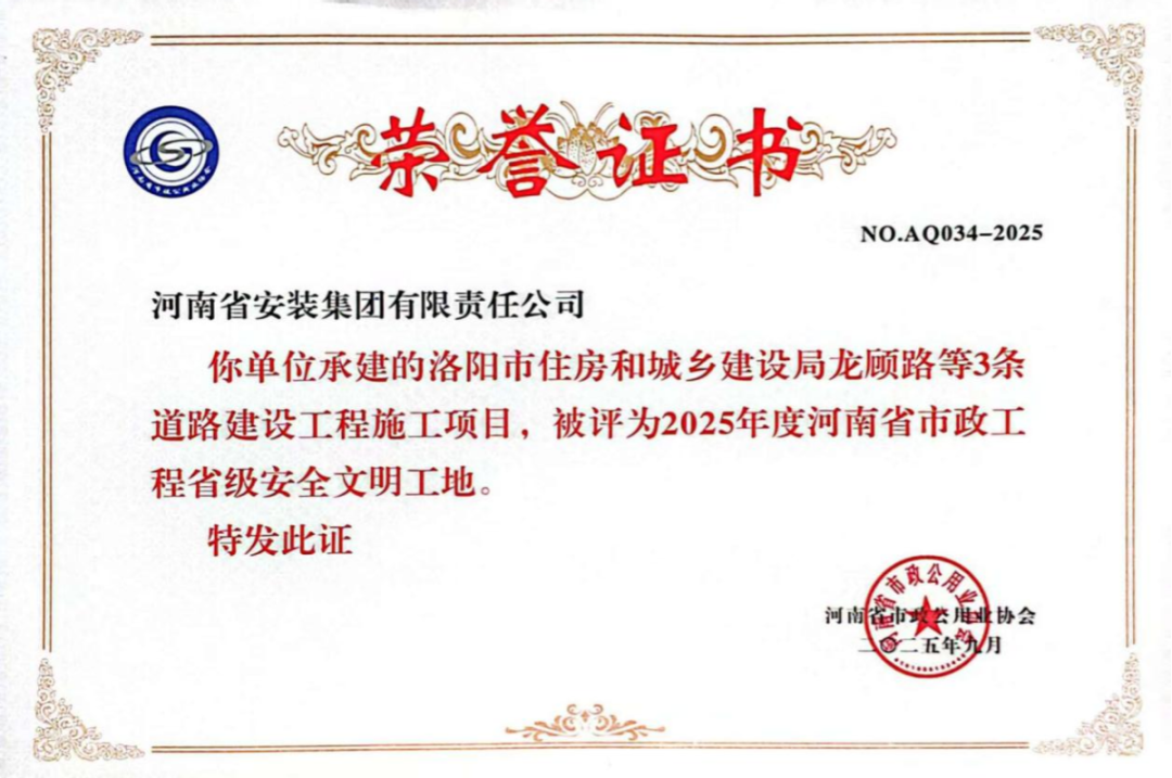 近日,由市政工程事業(yè)部承建的龍顧路等3條道路建設(shè)工程施工項目被河南省市政公用業(yè)協(xié)會認(rèn)定為2025年度河南省市政工程省級安全文明工地。